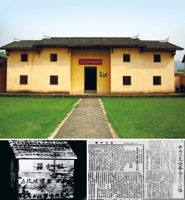 在中央苏区、延安时期,我们党探索了一套对苏维埃政府、边区政府和革命根据地人民政权组织及其工作人员的监督办法。上图为江西瑞金中华苏维埃共和国工农检察委员会旧址;下左图为当年江西兴国县高兴区苏维埃政府工农检察部设置的控告箱;下右图为《红色中华》报关于中央印刷厂等单位贪污案查处结果和检举于都县苏维埃工作人员营私贪污案的报道。中共江西省赣州市委党史办供图